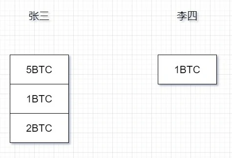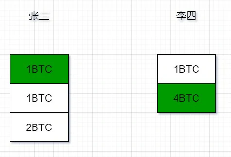 现在张三要给李四转 4 个 BTC,首先张三拥有的 UTXO 中没有正好包含 4 个 BTC 的 UTXO,但是张三可以选择将包含 5 个 BTC 的 UTXO,转账给李四 4 个 BTC,然后转账给自己 1 个 BTC,就完成了一笔交易。本地交易的输入为张三持有的包含 5 个 BTC 的 UTXO,输入给下图中绿色的 UTXO。