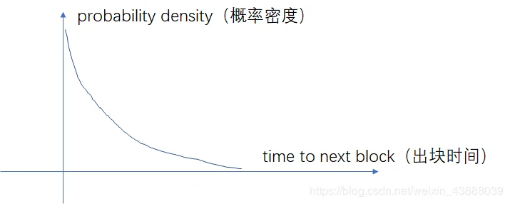 挖矿的过程就是不断尝试各种 nonce 来求解 puzzle,每次尝试 nonce 都可以看作一个 Bernoulli trial:a random experiment with binary outcome(伯努利试验:一个二元结果的随机试验)。伯努利实验的经典案例是抛硬币,如果硬币不均匀,每次实验,正面的概率就是 p,反面的概率是 1-p。对于挖矿来说,这两个概率相差甚远,每次尝试一个nonce,成功的概率是微乎其微的,大概率不行的,如果我们做大量的伯努利实验,每个实验都是随机的,那么这些伯努利实验就构成了一个 Bernoulli process:a sequence of independent Bernoulli trial(伯努利过程:一系列独立伯努利试验)。Bernoulli process 的一个特性是无记忆性(memoryless),意思是说做大量实验,前面的实验结果对后面的结果没有影响,挖矿过程就是不断尝试nonce,这种情况下 Bernoulli process可以用 Poisson process 来近似,实验次数很多,每次成功的概率很小就可以用 Poisson process 来近似。我们关心的是出块时间,也就是系统里产生下一个区块的时间,这个在概率上可以推导出来,服从指数分布。