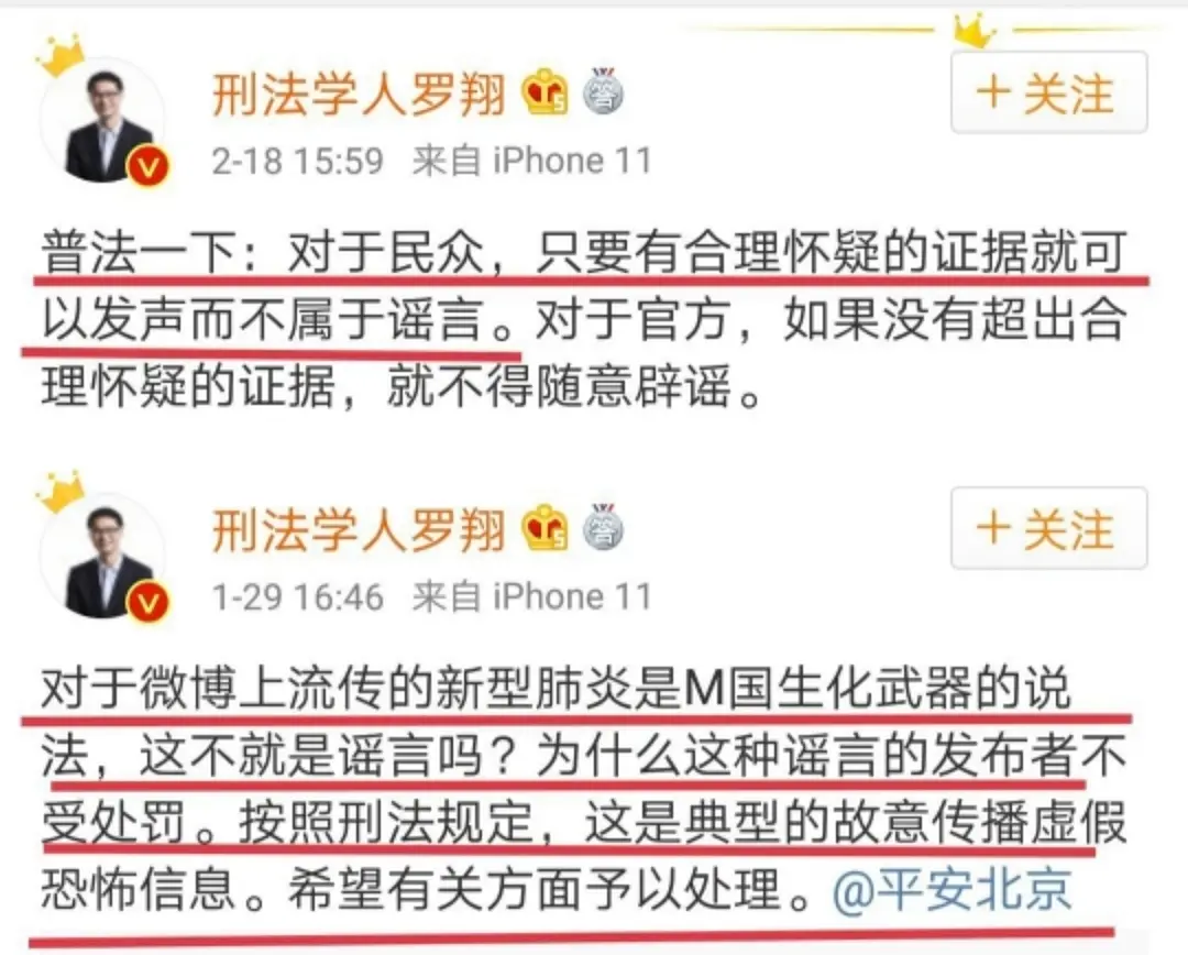 这里罗老师被质疑的一点是罗老师认为 “ 2019-nCoV(时称新冠病毒)是 M 国生化武器” 是谣言。但是自己又发微博说:“只要有合理怀疑的证据就可以发声而不属于谣言”。