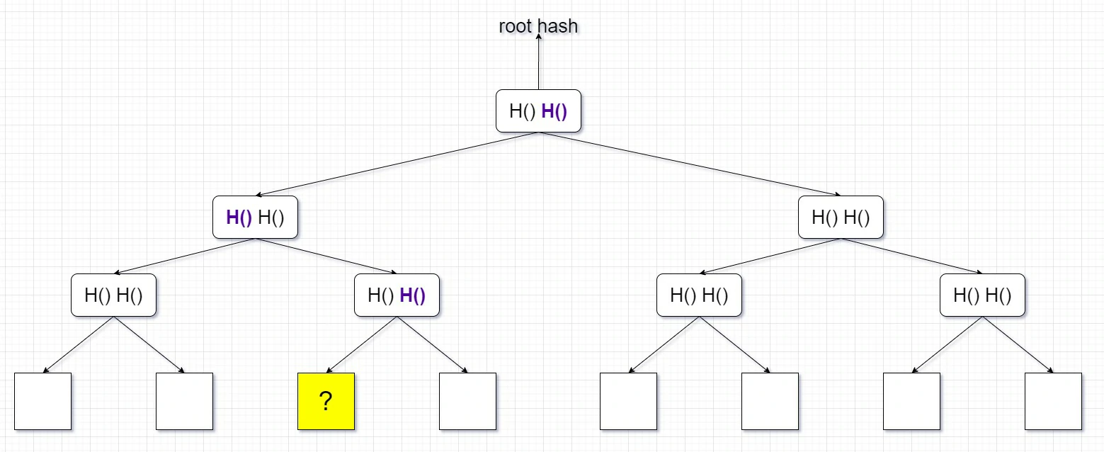那么假如我想知道某个block是否已经写在了Merkle Tree里,则可以向其它节点请求下图中紫色的 Hash,然后通过计算 Hash 就可以验证。