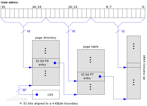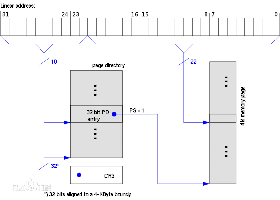 - 取出线性地址中的 22 位~31 位共 10 位作为页目录项在页目录中的索引,由此找到页目录项。