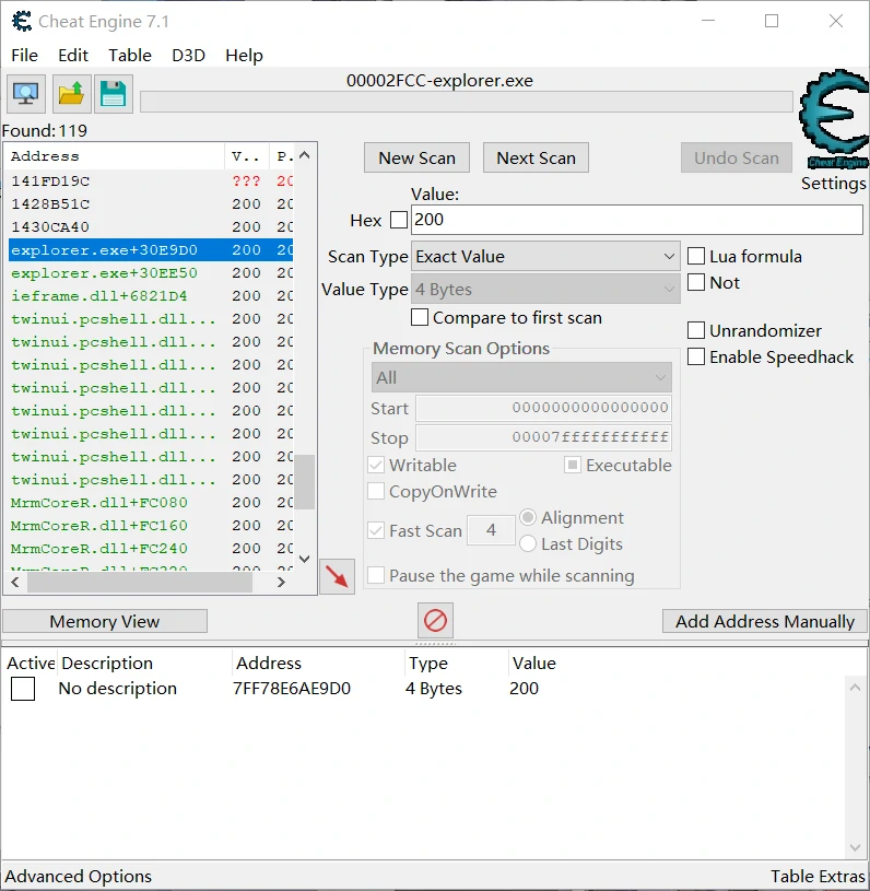 使用 CE 搜索这个值,发现透明度存储在explorer.exe + 0x30E9D0,修改后可立即生效。