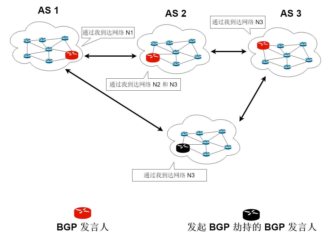 BGP 协议并不能验证 BGP 发言人所声明的信息是否为真,也就是说 BGP 发言人完全可以声明一个不属于自己的网络,然后将被声明的网络的流量引到自己的自治系统内,完成 BGP 劫持。