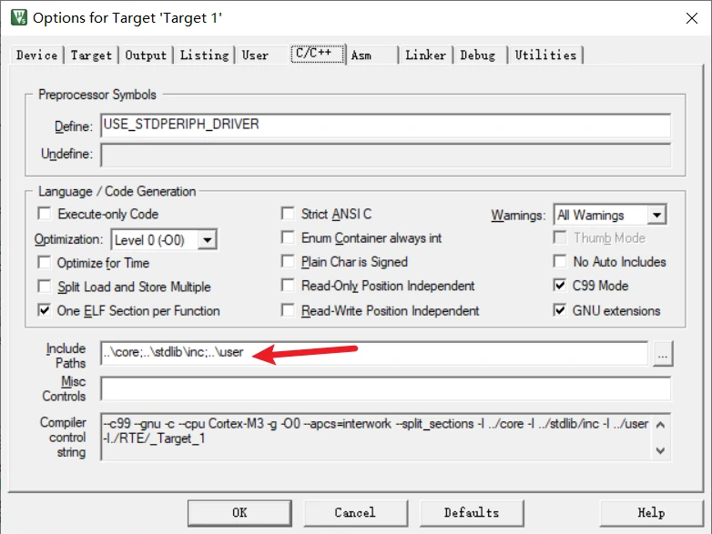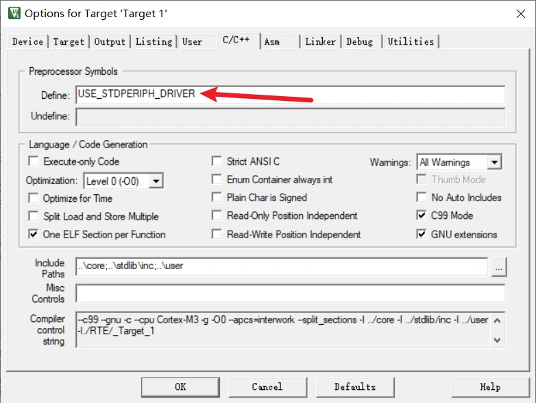 USE_STDPERIPH_DRIVER。 - 根据STM32 – Keil中启动文件的选择和固件库宏定义选择对应的宏如STM32F103R6就填入