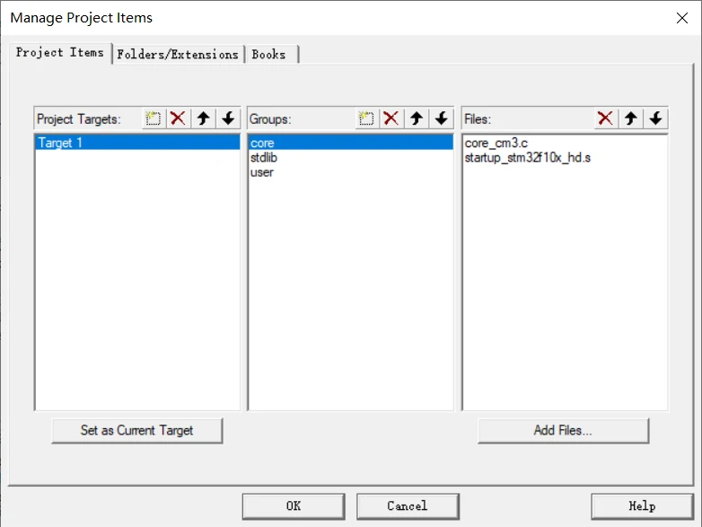 Libraries\CMSIS\CM3\DeviceSupport\ST\STM32F10x下的stm32f10x.h,system_stm32f10x.c,system_stm32f10x.h到Template\core下。 - 拷贝